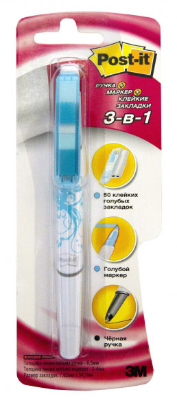 (арт. 21986486) Ручка-маркер 3M 691-BLU1-RU Post-it 3в1 "Комбо Голубой" с закладками