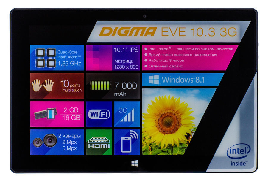 (арт. 21785756) Планшет Digma EVE 10.1 3G TS1014E3G Bay Trail (2.0) 4C Atom/RAM2Gb/ROM16Gb/10.1" IPS 1280*800/3G/WiFi/BT/5Mp/2Mp/GPS/W8/black/Touch/microSDHC 32Gb/GPRS/EDGE/UMTS/HSDPA/HSUPA/DLNA/mHDMI/minUSB/7000mAh/8hr/200hrs Bay Trail Quad Core(4C/4T) 22NM Technology P