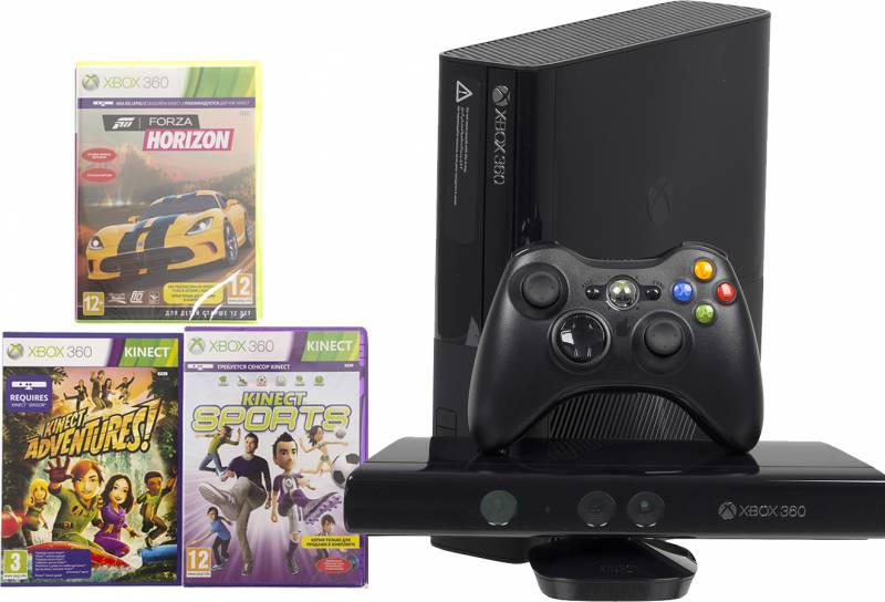 (арт. 21957607) Игровая консоль Microsoft Xbox 360 4GB E (N7V-00088) Stingray с KINECT черный игры: Kinect Sport 1, Forza Horizon, Kinect Adventures в комплекте
