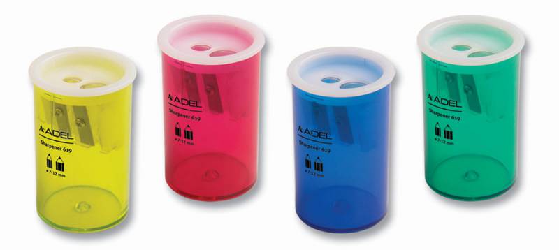 (арт. 21813456) Точилка Adel 426-0619-000 2 отверстия корпус прозрач. пластик ассорти (крас/желтый/зеленый/синий)