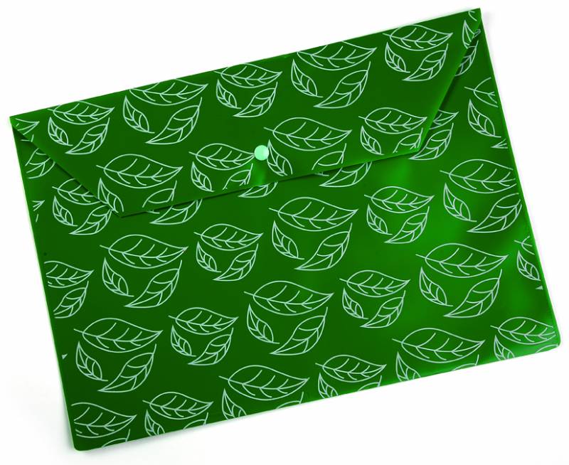 (арт. 21816679) Конверт на кнопке Бюрократ PK813Ngrn непрозрач. глянц. с рисун. "Листочки" А4 пластик 0.18мм зеленый