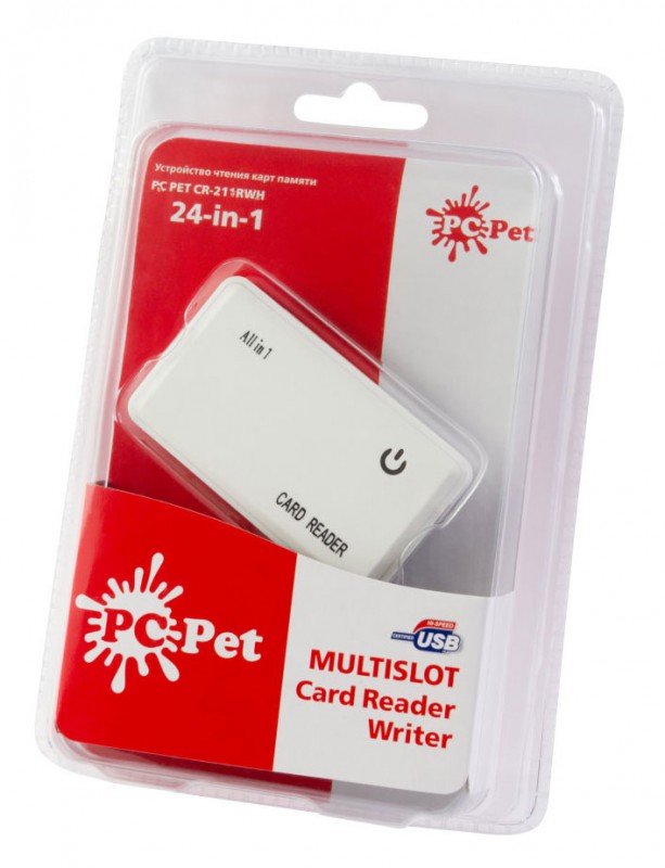 В интернет магазине JIN.SU Вы можете купить Устройство чтения карт памяти PC Pet CR-211RWH белый (24-in-1) USB2.0 ext CF/SD/microSD/MMC/RS-MMC/MS/MSduo/XD/microMS по очень низкой цене, а так же заказать доставку или забрать товар самовывозом. Оплатить товар можно наличными курьеру, курьеру по банковской карте или банковской картой на сайте интернет-магазина. Более подробно о способах доставки и оплаты читайте в соответствующих разделах сайта.
