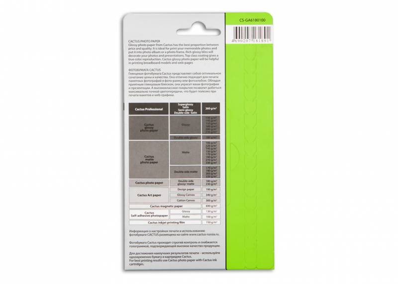 (арт. 21790634) Фотобумага Cactus CS-GA6180100 10x15cm/180г/м2/100л. глянцевая для струйной печати