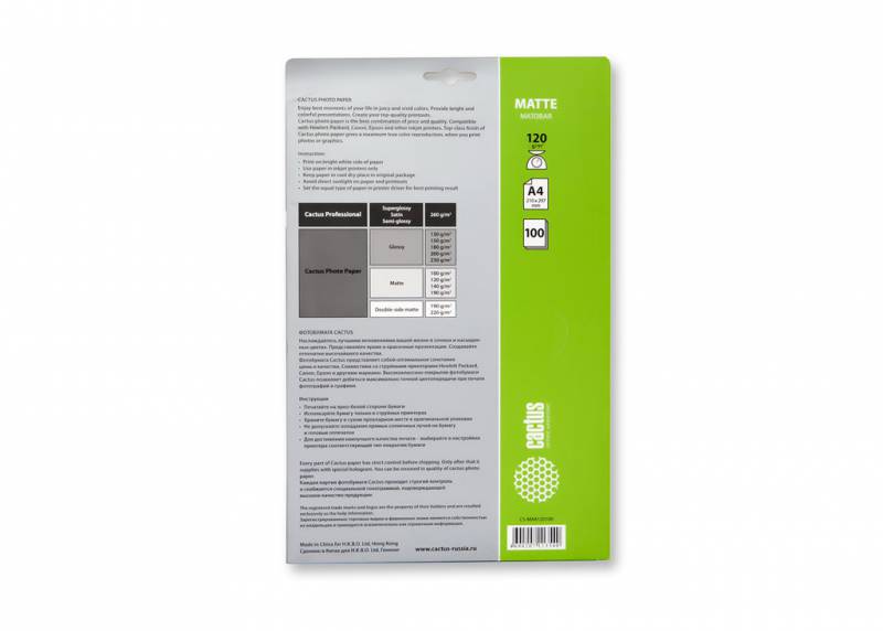 В интернет магазине JIN.SU Вы можете купить Фотобумага Cactus CS-MA4120100 A4/120г/м2/100л. матовая для струйной печати по очень низкой цене, а так же заказать доставку или забрать товар самовывозом. Оплатить товар можно наличными курьеру, курьеру по банковской карте или банковской картой на сайте интернет-магазина. Более подробно о способах доставки и оплаты читайте в соответствующих разделах сайта.