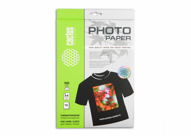 В интернет магазине JIN.SU Вы можете купить Термотрансфер Cactus CS-TD30010 A4/300г/м2/10л. для струйной печати для темных тканей по очень низкой цене, а так же заказать доставку или забрать товар самовывозом. Оплатить товар можно наличными курьеру, курьеру по банковской карте или банковской картой на сайте интернет-магазина. Более подробно о способах доставки и оплаты читайте в соответствующих разделах сайта.