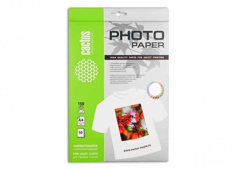 В интернет магазине JIN.SU Вы можете купить Термотрансфер Cactus CS-TD15010 A4/150г/м2/10л. для струйной печати для светлых тканей по очень низкой цене, а так же заказать доставку или забрать товар самовывозом. Оплатить товар можно наличными курьеру, курьеру по банковской карте или банковской картой на сайте интернет-магазина. Более подробно о способах доставки и оплаты читайте в соответствующих разделах сайта.