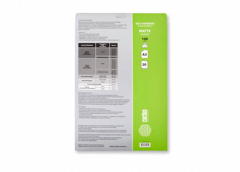 (арт. 21805866) Самоклеящаяся бумага фотобумага Cactus CS-MSA310020 матовая А3 100 г/м2 20 листов